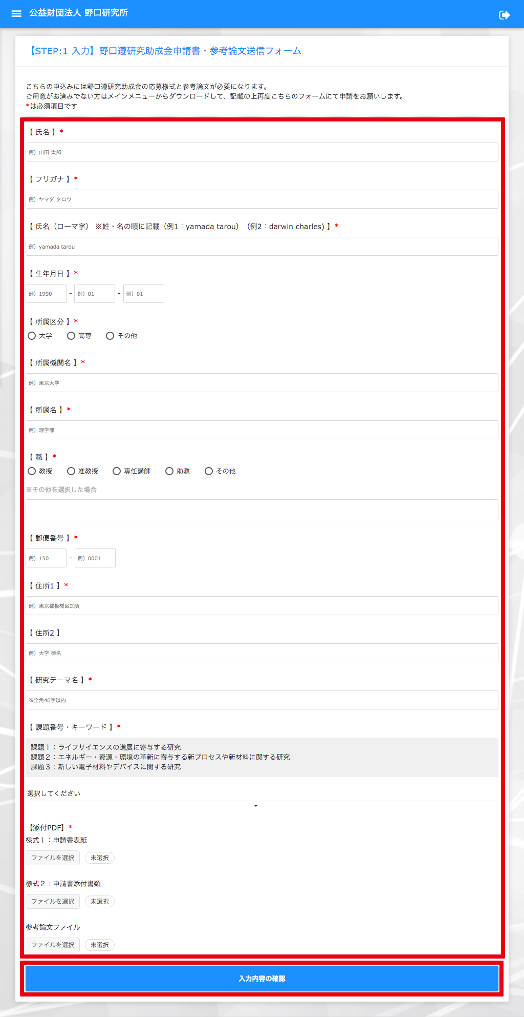 当所助成金事務局で新たにパスワードを再設定いたします。 当事務局にメール(josei@noguchi.or.jp)にて、パスワードを忘れた旨と以下をご連絡ください。 ① お名前 ② 登録したメールアドレス 後日、当事務局よりご登録いただいたメールアドレスに、新しいパスワードをご連絡いたします。(数日お待ち頂くことになります) なお、パスワードは、新規登録時は各自で設定できますが、自ら設定したパスワードの変更や再設定後の新しいパスワードを変更することはできません。予めご承知頂くとともに、パスワードを忘れないよう管理をお願いします。